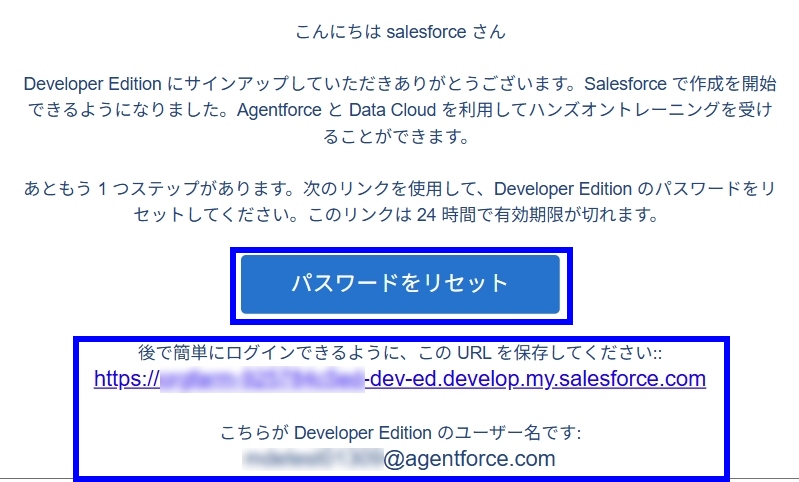 アカウント登録後、送付されるメールからパスワードをリセットし、またsalesforceのログインIDとURLも保存しておきます。