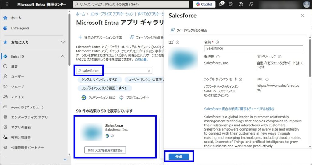 手順2:Entra ID で Salesforce アプリケーションを作成
