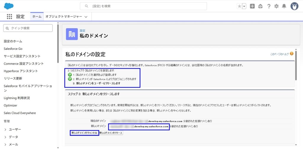 次の画面遷移で、”ステップ2: プロビジョニングが進行中”と出ます。5分ほど待つと、Salesforceからメールが届き、”Salesforceの[私のドメイン] xxx.develop.my.salesforce.comのテスト準備が整いました”と通知が来ます。また、Salesforceの画面をリロードすると以下の画面に切り替わっておりますので、”新しいドメインをリリース”をクリックします。