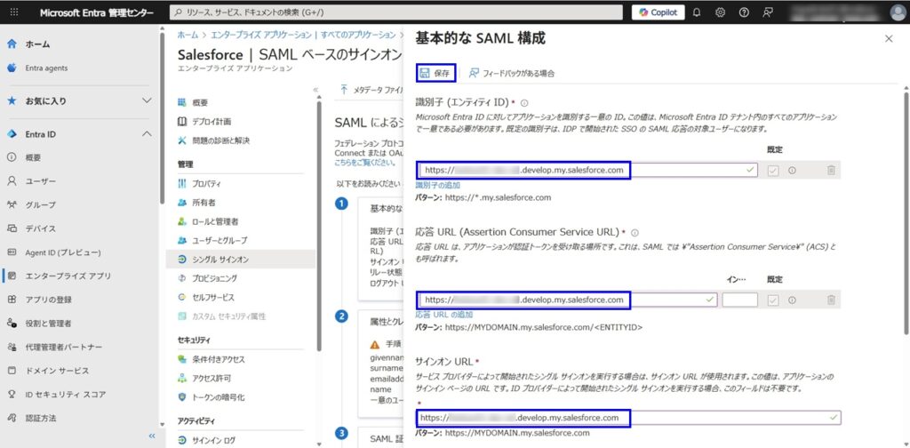 - [SAML によるシングル サインオンのセットアップ] > [基本的な SAML 構成] > [編集]をクリックし、手動で以下を設定、保存をクリックします。