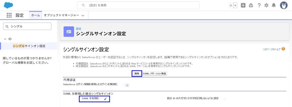 - [編集] をクリックし、[SAML Enabled] にチェックを入れて保存します。SAML有効化にチェックマークがつきます