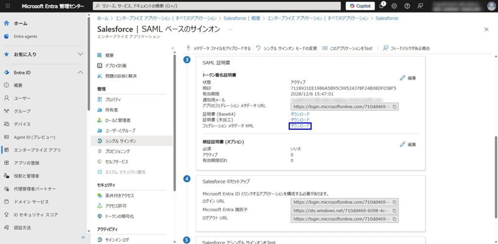 - SAML証明書セクションでは、Entra ID側の証明書を取得し、Salesforceへアップロードするため、 [SAML 署名証明書] セクションにある [フェデレーション メタデータ XML] をダウンロードします。