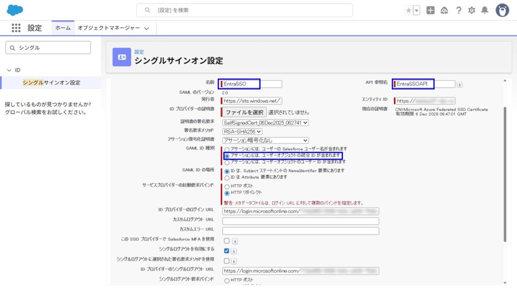 - 発行者、Entity ID、ログインURL、ログアウトURL等が自動入力されます