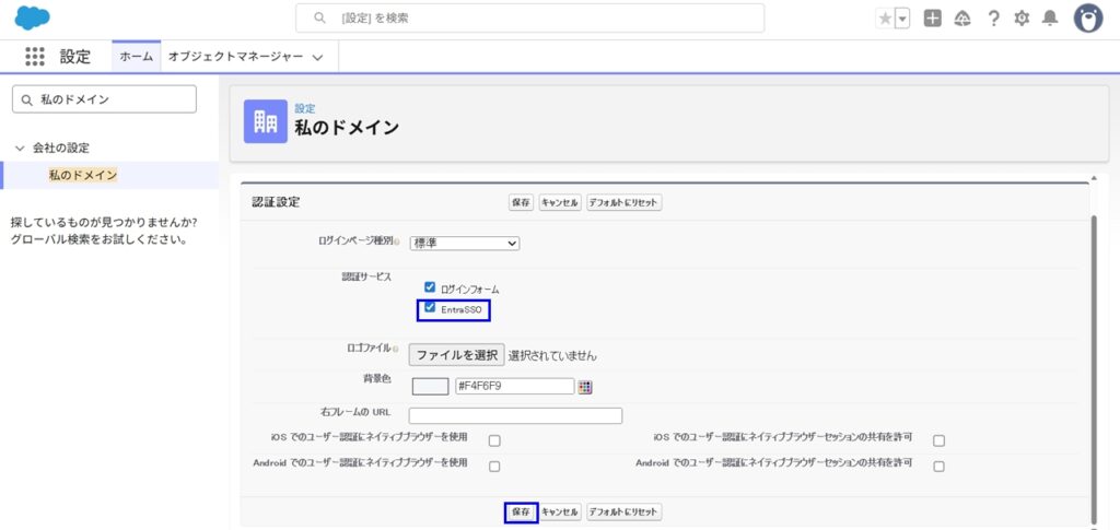 SAML設定を作成しただけでは、Salesforceログインページに適用されません。画面左上検索ボックスで”私のドメイン”で検索、[私のドメイン]を選択 > 認証設定の[編集]をクリックすると、「認証サービス」という設定項目が表示されます。ここで、先ほど作成した SAML 設定の名前(例:EntraSSO)にチェックし、保存ボタンをクリックすることで、Salesforce のログイン画面にEntra ID 経由のログインボタンが表示されるようになります。