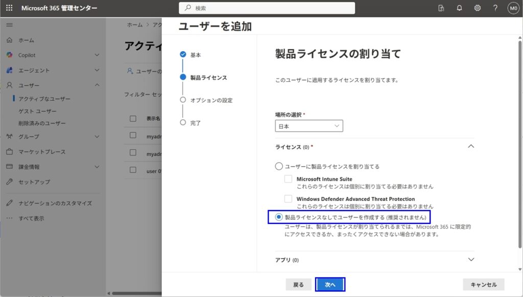 - Microsoft 365管理センターにログイン、画面左の[ユーザー] > [アクティブなユーザー] > [ユーザーの追加]で、エンドユーザーを作成します。特に難しい部分はありませんが、製品ライセンスの割り当てでは、”製品ライセンスなしでユーザーを作成する”を選択します。それ以外は、すべてデフォルトの設定の通りに進めます。今回はuser01@xxx.onmicrosoft.comを作成しました。