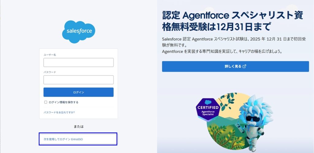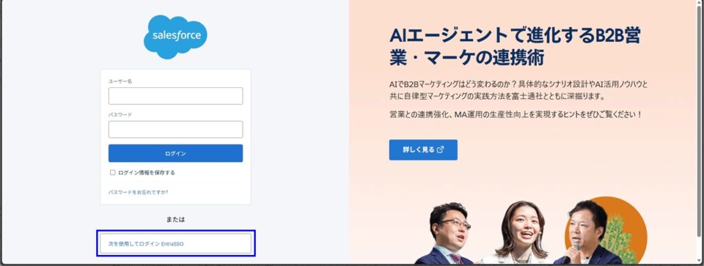 一度ログアウトすると、Salesforceのログイン画面にEntra ID経由のログインボタンが表示されます。