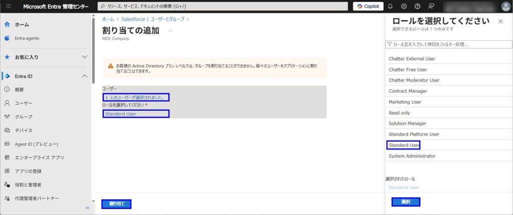 - 作成後は、Microsoft Entra管理センターにアクセス、画面左の[エンタープライズアプリ] > [Salesforce] > [1. ユーザーとグループの割り当て] > [ユーザーまたはグループの追加] >ユーザーにuser01を、ロールにStandard Userをクリック、割り当てをクリックします。