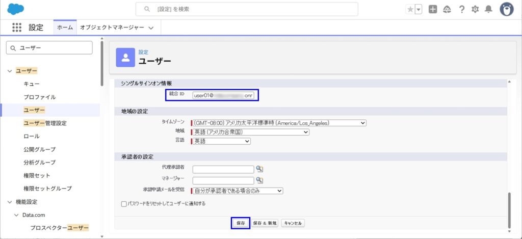- [新規ユーザー]で、ユーザーライセンスはSalesforce、プロファイルは標準ユーザー、メール、ユーザー名はMicrosoft 365管理センターで作成したUPN(user01@xxx.onmicrosoft.com)を設定します。ほかの部分は下の画像の通り設定します。画面下にスクロールし、統合IDをUPNに設定します。