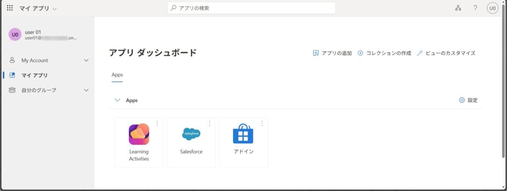 - 検証用ユーザー(user01@xxx.onmicrosoft.com)でMy Appsポータル(https://myapps.microsoft.com)にサインインします。これまでのブラウザではEntra IDの管理者のセッションが残っているため、異なるブラウザ(ChromeでEntra ID設定していたなら、EdgeなどでSSOを実施)を使います