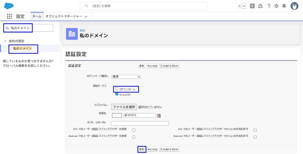 - このやり方ですと、エンドユーザーからはSalesforceのログイン画面に遷移する手間が余計であるため、管理者でSalesforceにログインし、画面右上の[歯車] > [設定] > 画面左上の検索ボックスで”私のドメイン”で検索 > 画面左の[私のドメイン] > 認証設定の[編集]をクリックします。ログインフォームのチェックを外して保存をクリックします。